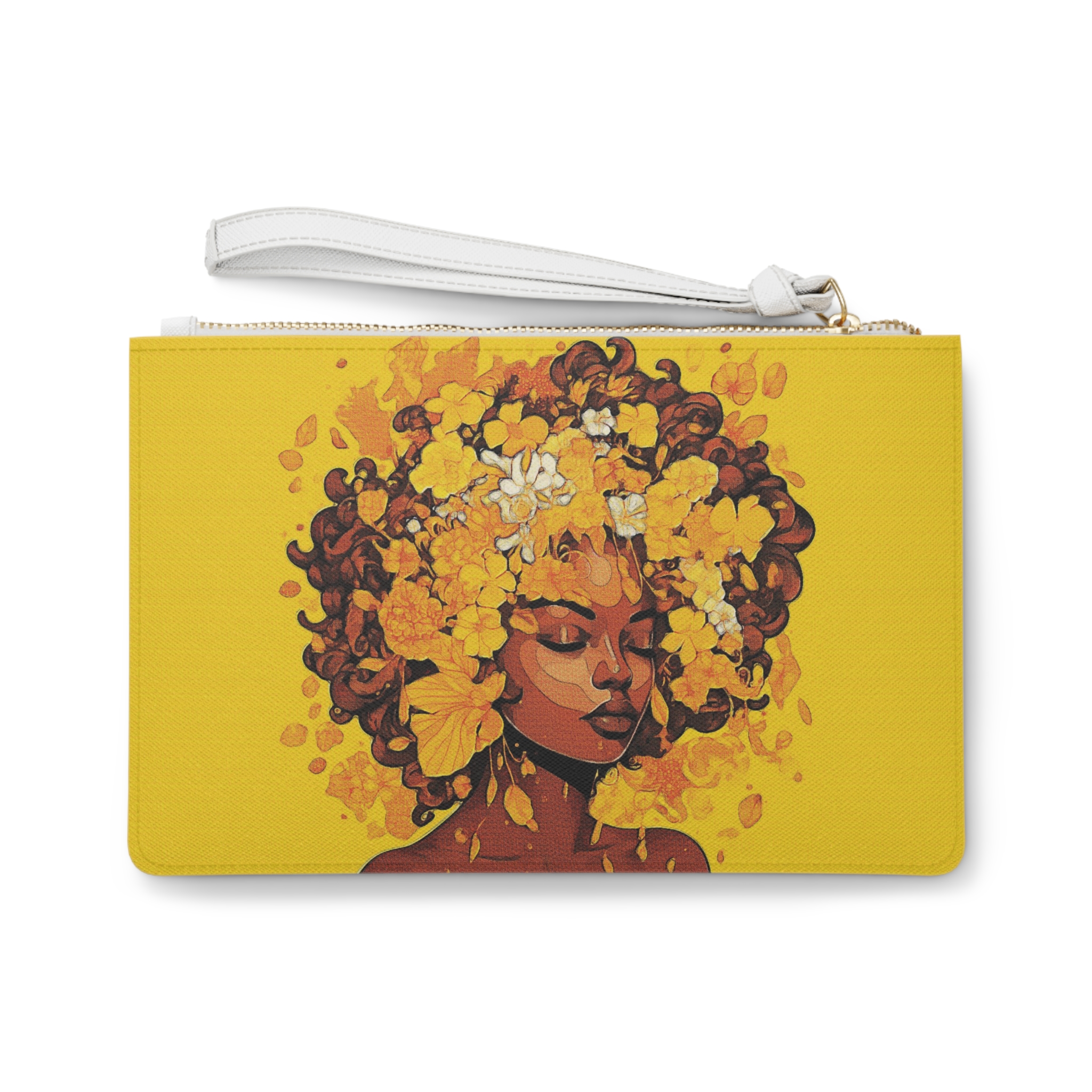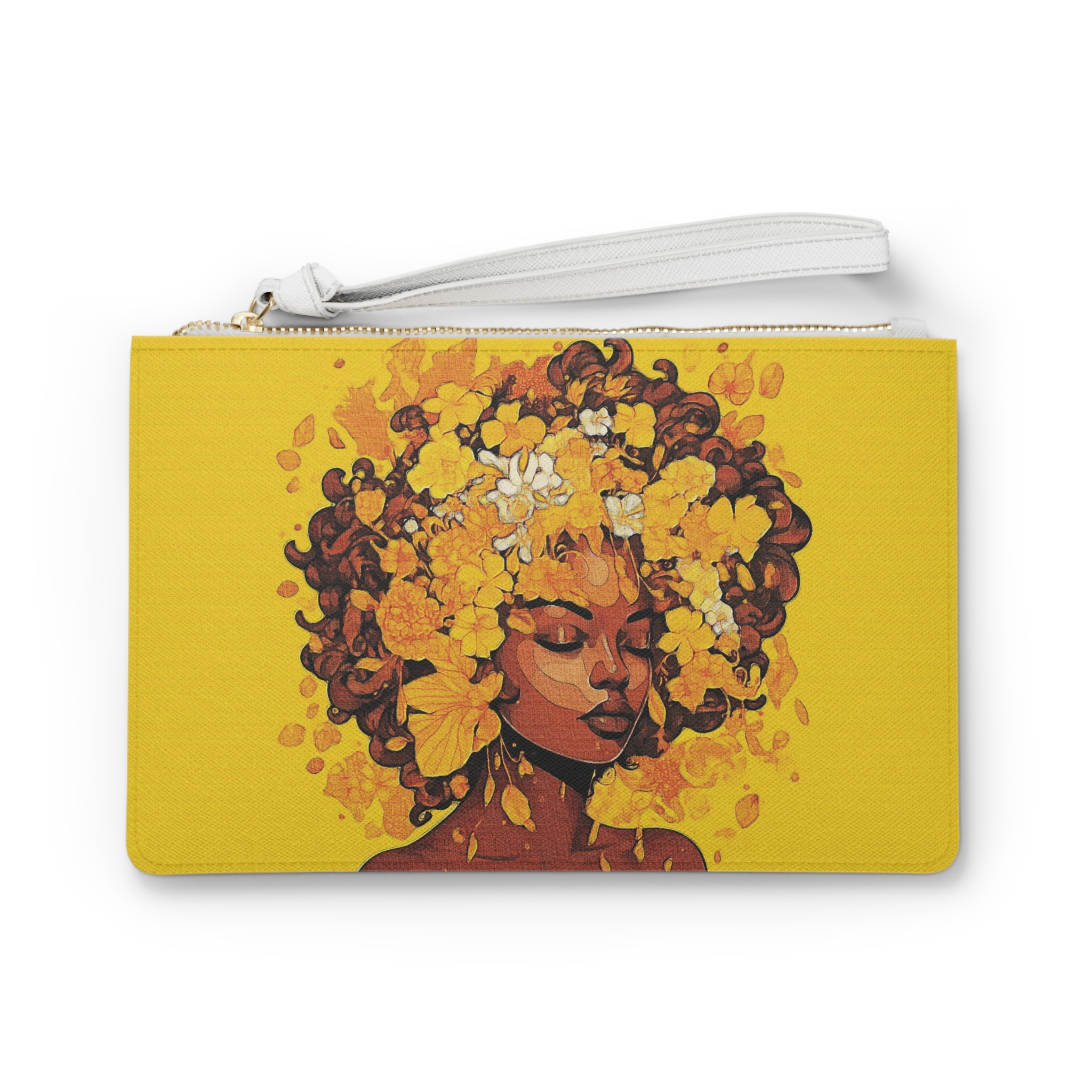 Our women’s clutch bags featuring a beautiful Black woman in vivid colors, now with the option of personalization, celebrate diversity and individuality. By carrying this artwork, you are making a statement about your values and embracing the beauty of representation.