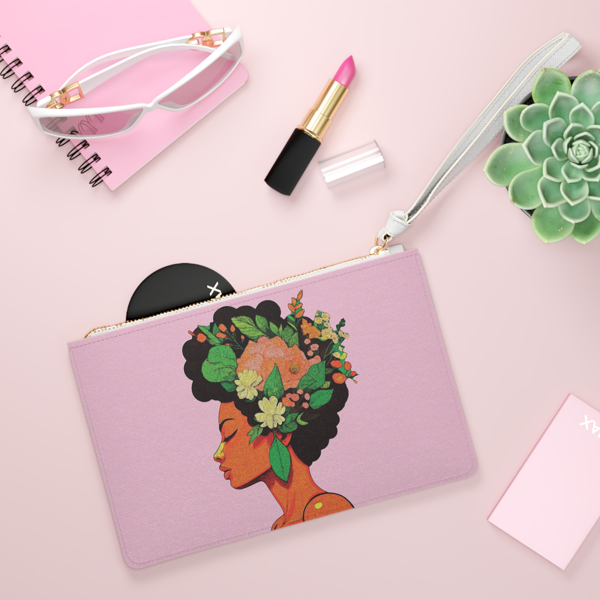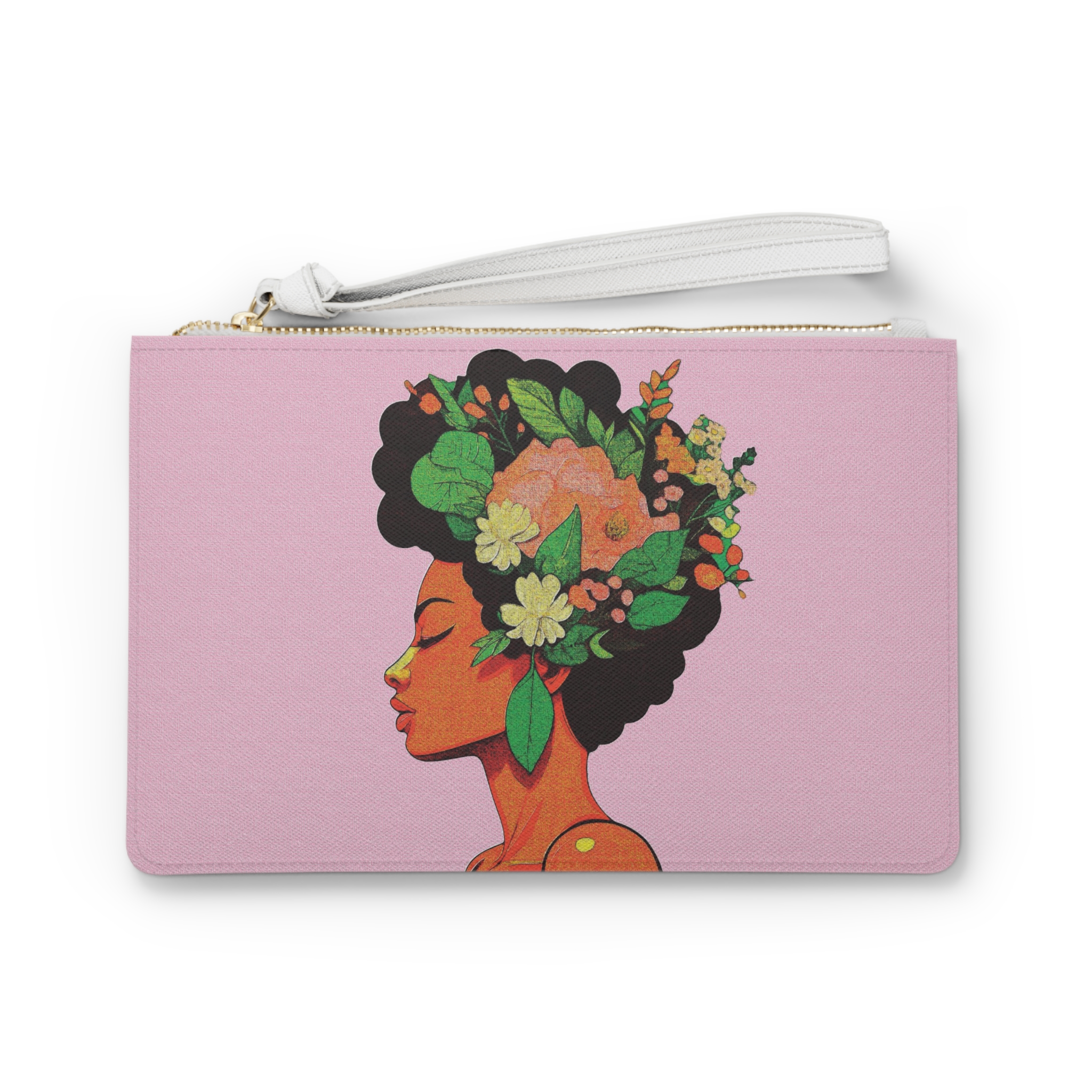 Our women’s clutch bags featuring a beautiful Black woman in vivid colors, now with the option of personalization, celebrate diversity and individuality. By carrying this artwork, you are making a statement about your values and embracing the beauty of representation.